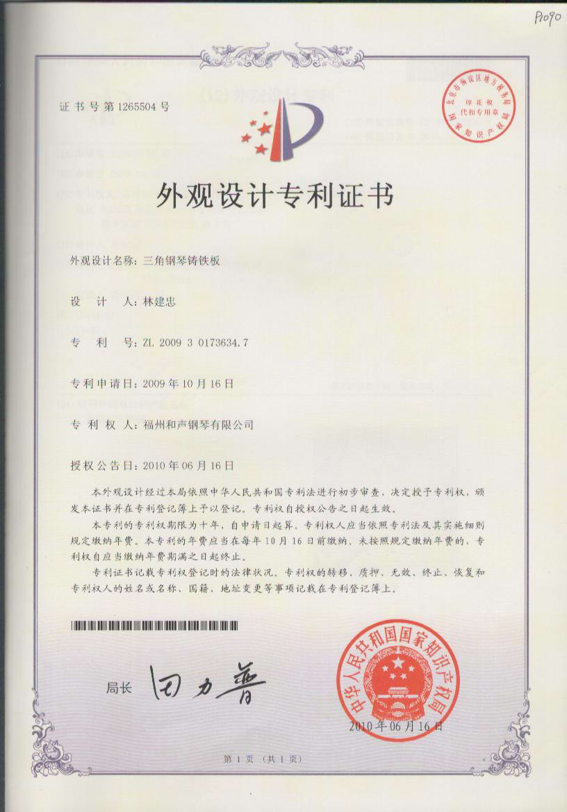 三角鋼琴真空鑄造浮雕式鑄鐵板(外觀設計專利,專利號:ZL 2009 3 0173634.7) 2018-06-28 09:31:38
